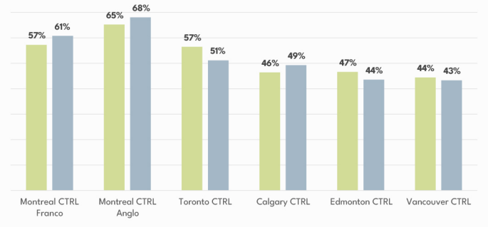 A second breakout illustrates in-home radio tuning in six Canadian markets. As shown below, Montreal has the highest proportion of in-home tuning in both 2024 and 2025: