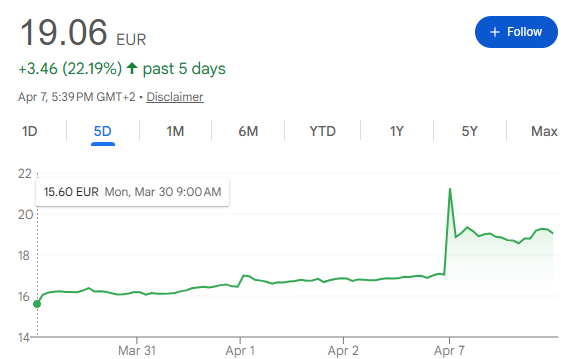 UMG stock spiked considerably in the wake of this news, as the five-day chart below indicates.
