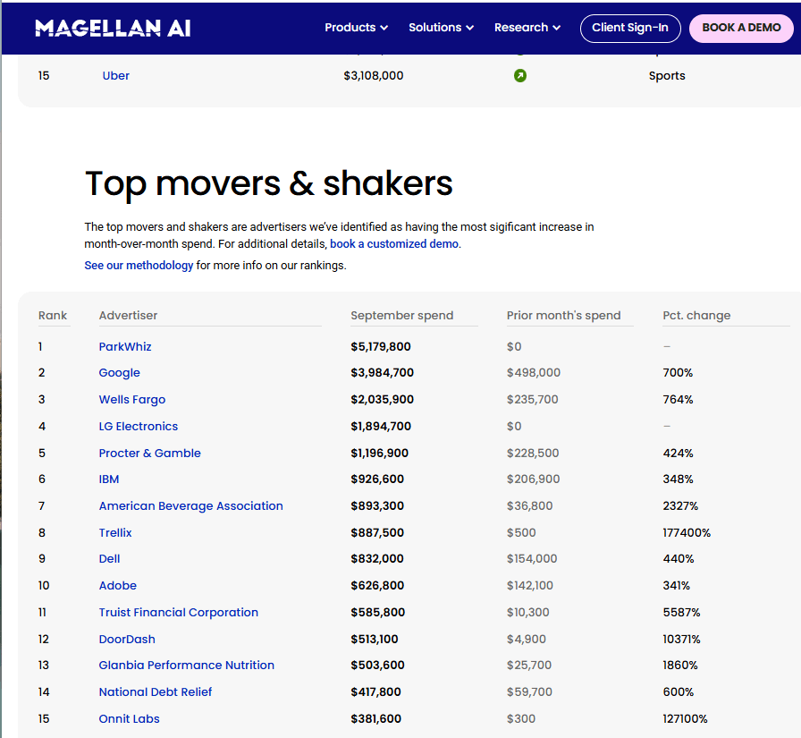 In that top-15 list we see 12 companies which increased their month-over-month spends, and five which decreased.