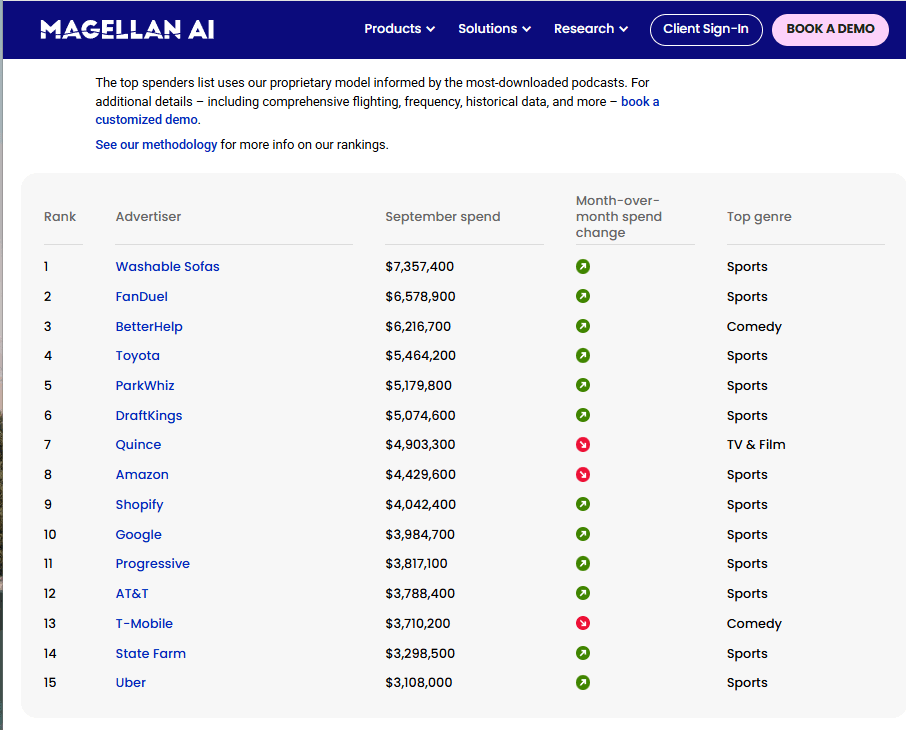 The top-spending podcast advertiser in September was Washable sofas, which invested $7.3-million in the month. That info from stalwart measurement company Podtrac in the September edition of its Top Spenders. In the 15-company list, the spend range is bracketed by that number and the #15 spender (Uber) which invested $3.1 million.