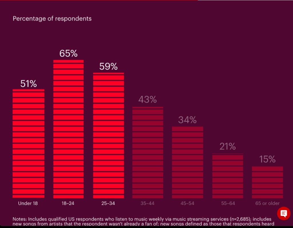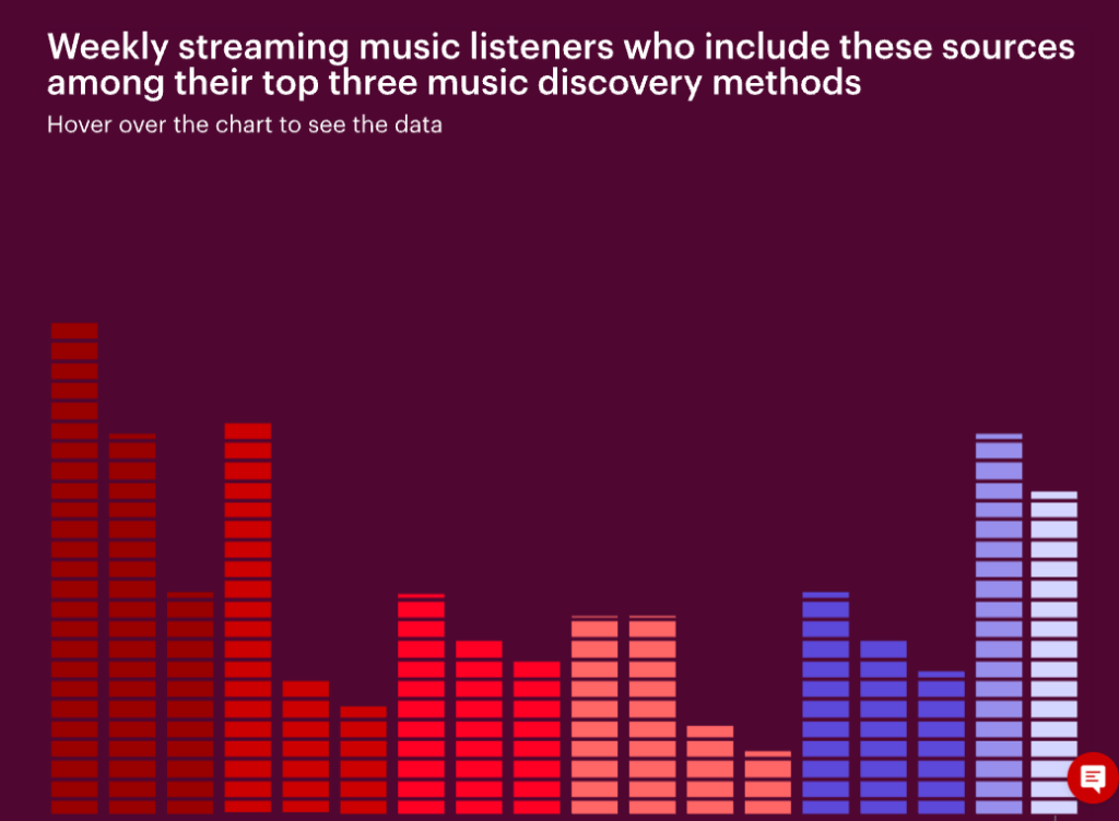 Bain has discovered that most listeners find new songs through playlists on streaming services, licensed plays in movies, TV shows, and videogames. Additionally — and this is crucial to Bain’s point — consumers lean hard on recommendations from friends, family, and trusted online communities. Older recommendation methods like radio, MTV, and big-box record stores (characterized as “one-to-many”) are giving way.