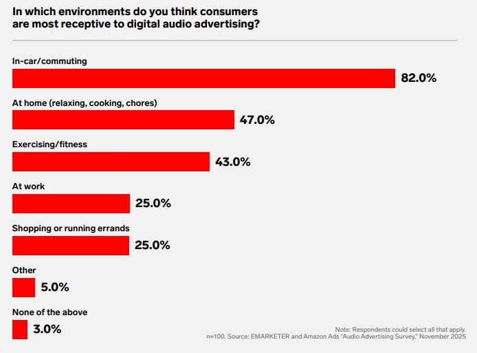 A newly released advertiser survey conducted by EMARKETER, in partnership with Amazon Ads, is titled A Sound Move: Marketers say digital audio is ready for bigger investment. The field work queried 100 U.S. marketers about the value of investing in digital audio advertising.