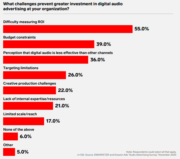 With all the positives of digital audio advertising come challenges. Among the many typical candidates — such as budget, production, and resources — measuring the return on investment leads other worries by far.