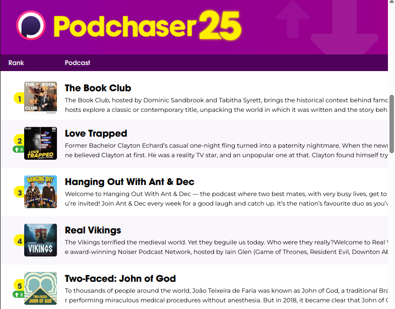 Called Podchaser 25, the ranker provides title, short description, publisher, hosting provider, podcast category, and a proprietary Power Score. That score presumably goes up to 100; the March edition’s #1-ranking podcast (The Book Club) is ranked at 81.