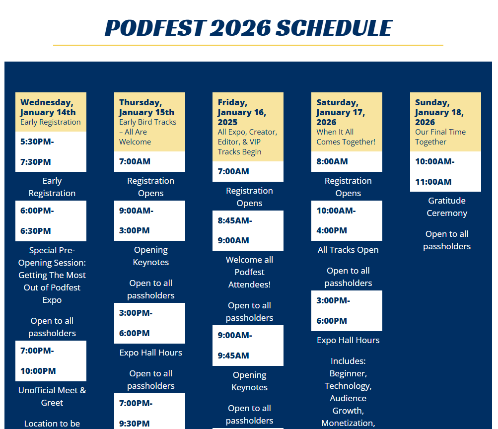 The 2026 edition of Podfest, formally known as the Podfest Expo, and even more elaborately titled the Podfest Multimedia Expo, is slated for January 15-18 in Orlando. (Info HERE.) Key topics, each of which contains multiple presentations, include Audience Growth, AI, Beginners, Editors, Monetization, and Video. And more. Click HERE for the details as they stand now.