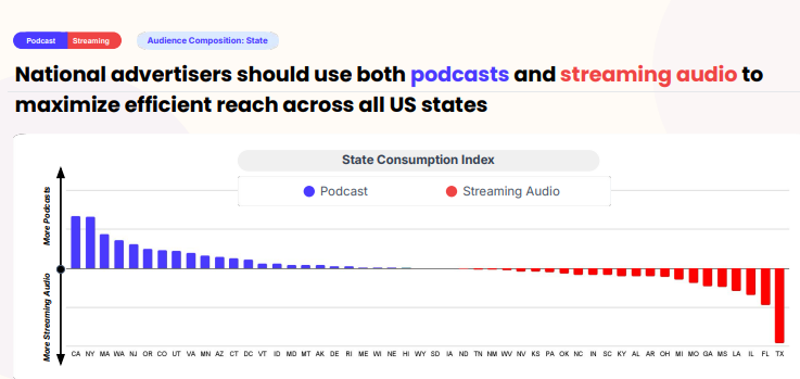 To guide advertisers, Podscribe has developed its State Consumption Index, a kind of nationwide competitive chart between podcast listening and streaming audio in each state.