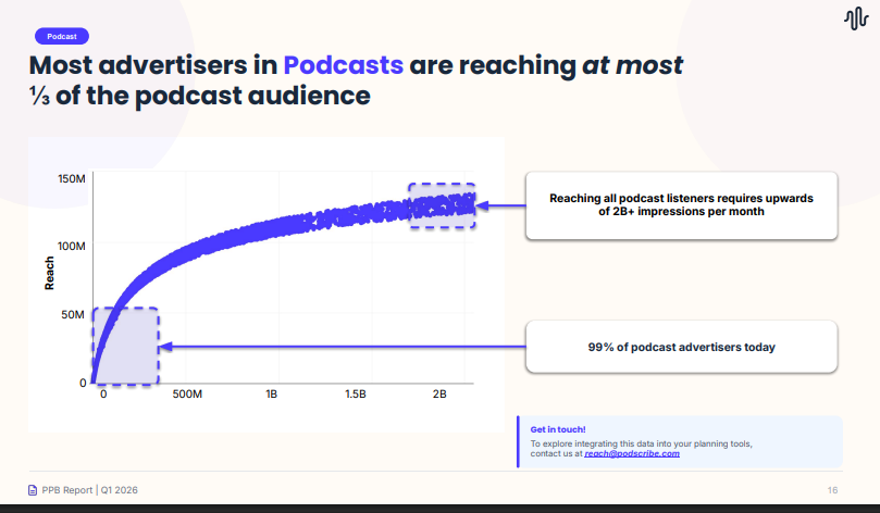 This Podscribe report introduces a Reach Curve, charting the extent to which podcast advertisers are reaching the total body of podcast listeners. Total reach would be represented by 2B+ impressions per month. (We’re a bit perplexed by an approximate number representing a solid metrical goal, but we get the overall point). Along with this metric is a graphic pointer to the reach of 99% of advertisers. See below.