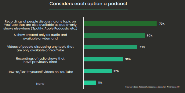 Interestingly, only 27% of respondents said that “how-to” videos were podcasts, reinforcing the idea that podcasts are primarily conversational or spoken.